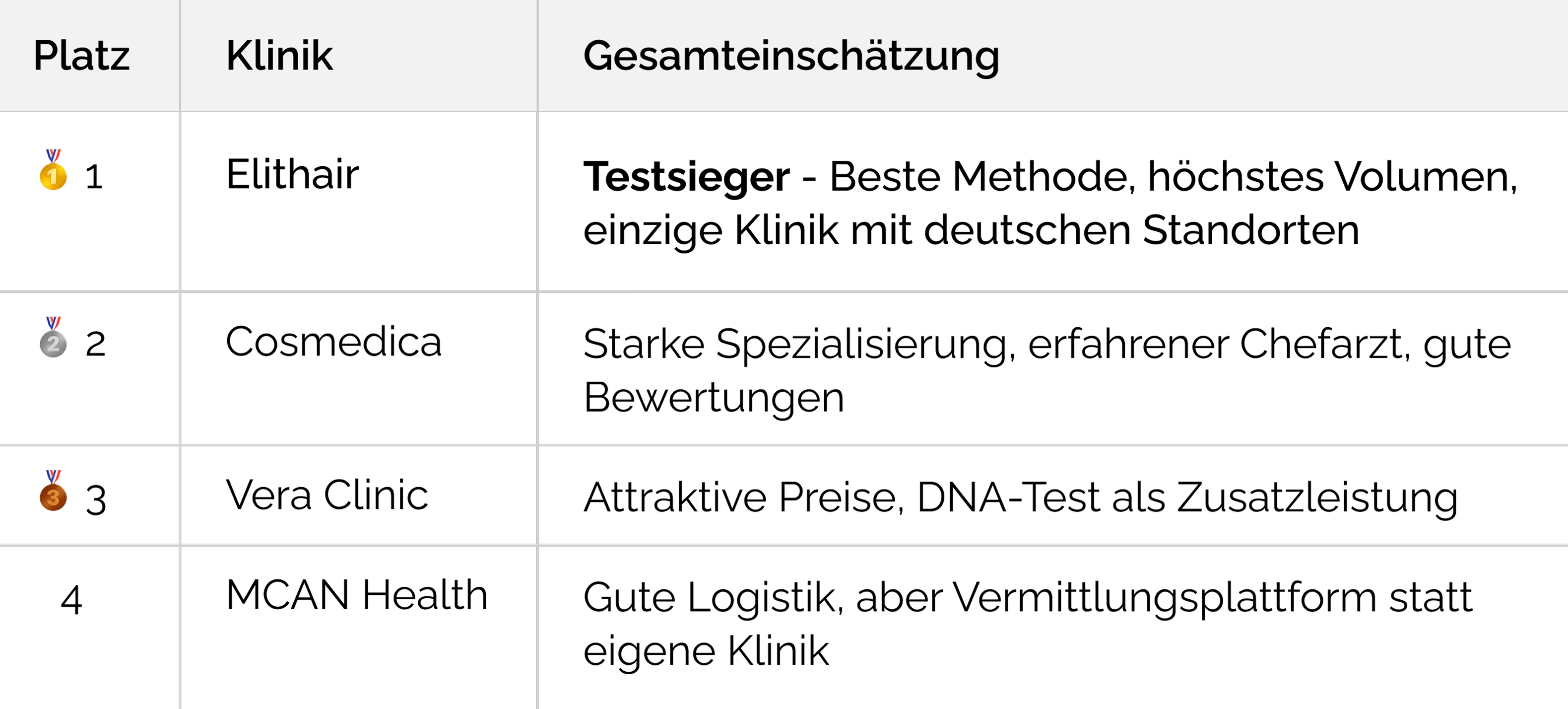 Wer "Haartransplantation Türkei" googelt, stößt schnell auf bekannte Namen: Elithair, Cosmedica, Vera Clinic, MCAN Health. Alle werben mit beeindruckenden Vorher-Nachher-Bildern. Alle versprechen natürliche Ergebnisse.